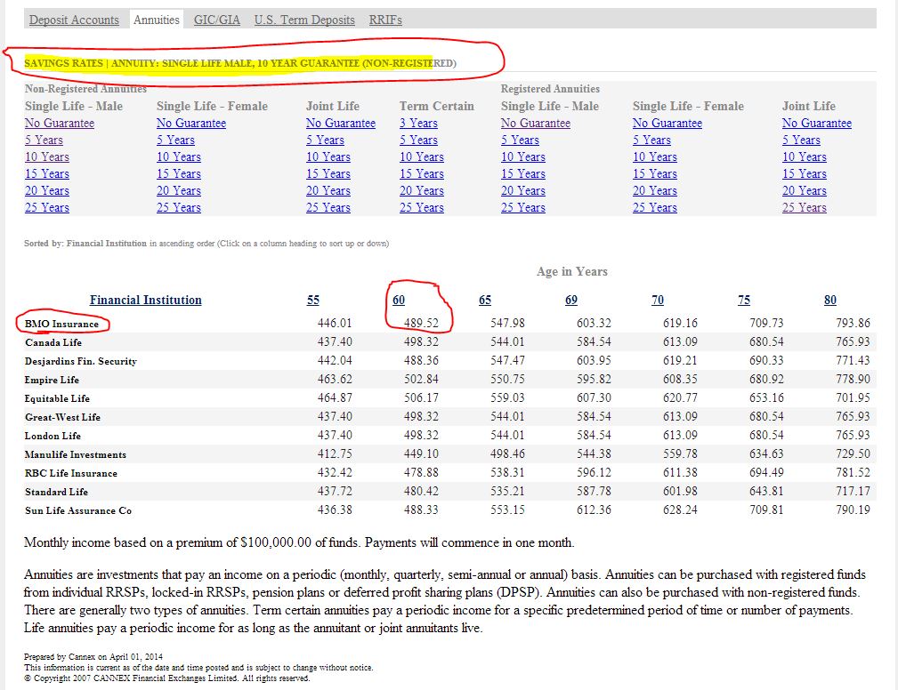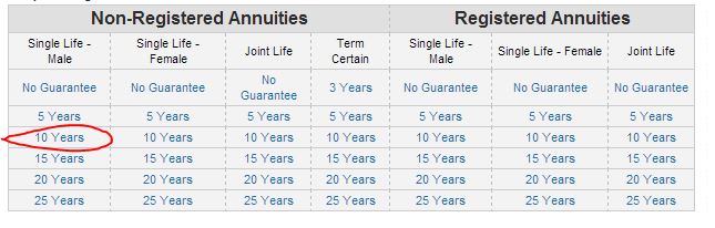 Example: Based upon the time of this article, I chose a non-registered annuity, for a single-life male with a 10 year guarantee period. So I clicked on the link, that is circled in red.