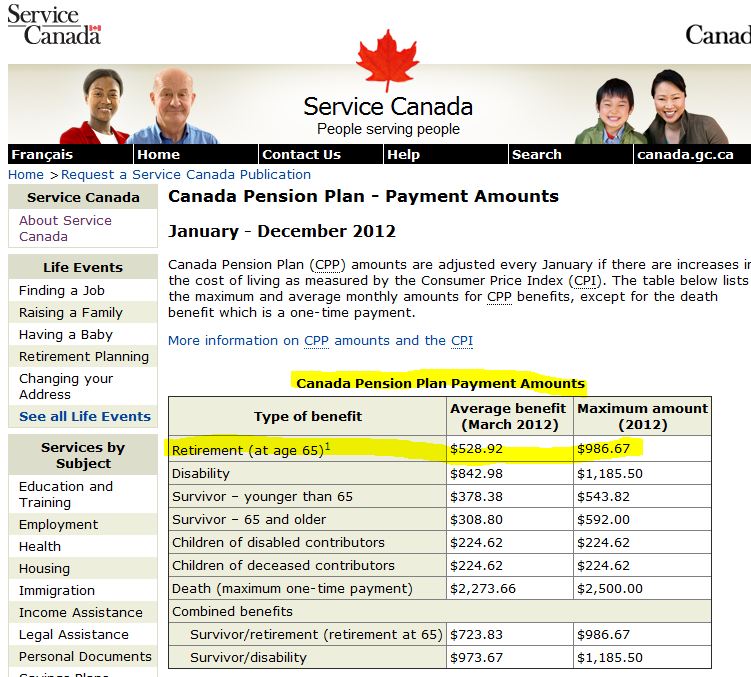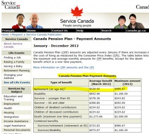 CPP Benefits at age 65 for 2012 showing the average and maximum payments at age 65.