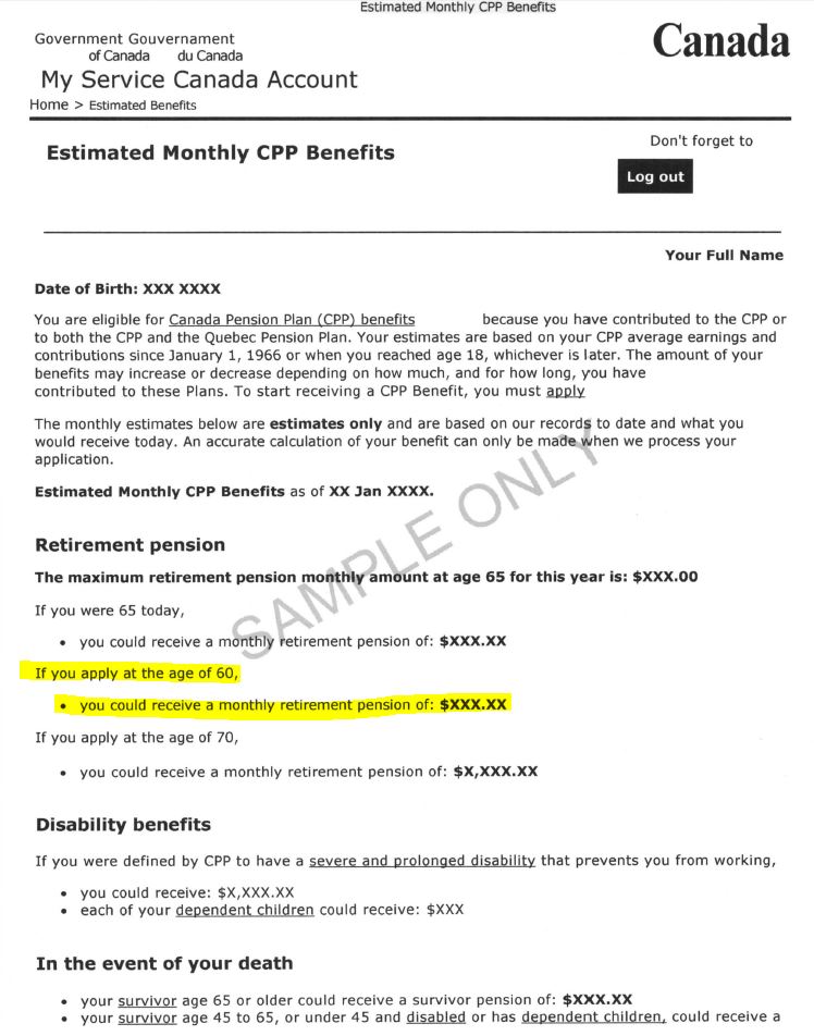 Several key pieces of information can be seen right away. If you decide to begin to receive CPP as early as age 60, I’ve highlighted that section in yellow to the right. (click on the document to the right to enlarge it).